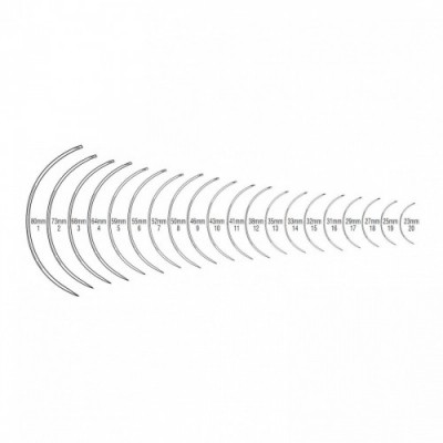 Indicazioni: Ago sutura semi curvo, 3/8 di cerchio, con sezione triangolare a cruna aperta. Gli aghi da 3/8 di cerchio, detti anche "curvi", sono gli aghi più comunemente usati. La curvatura li rende facili da manipolare in ferite grandi o superficiali. Gli aghi sono disponibili in confezioni da 12, nelle seguenti varianti Formati: 3/8 PUNTA TRIANG. C/APERTA: 1 - 80 mm C/APERTA 2 - 73 mm C/APERTA 3 - 68 mm C/APERTA 4 - 64 mm C/APERTA 5 - 59 mm C/APERTA 6 - 55 mm C/APERTA 7 - 52 mm C/APERTA 8 - 50 mm C/APERTA 9 - 46 mm C/APERTA 10 - 43 mm C/APERTA 11 - 41 mm C/APERTA 12 - 38 mm C/APERTA 13 - 35 mm C/APERTA 14 - 33 mm C/APERTA 15 - 32 mm C/APERTA 16 - 31 mm C/APERTA 17 - 29 mm C/APERTA 18 - 27 mm C/APERTA 19 - 25 mm C/APERTA 20 - 23 mm C/APERTA 3/8 PUNTA TONDA C/APERTA: 1 - 80 mm C/APERTA 8 - 50 mm C/APERTA 9 - 46 mm C/APERTA 10 - 43 mm C/APERTA 11 - 41 mm C/APERTA 12 - 38 mm C/APERTA 13 - 35 mm C/APERTA 16 - 31 mm C/APERTA 3/8 PUNTA TRIANG. C/CHIUSA 1 - 80 mm C/CHIUSA 5 - 59 mm C/CHIUSA
