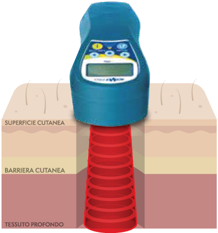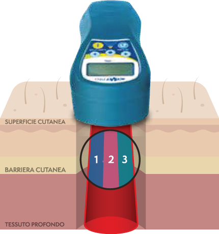 La sincronizzazione del laser super-pulsato (905 nm), degli IRED (875 nm) e dei LED rossi (660 nm) insieme a un campo magnetico statico ottimizza l’assorbimento della luce saturando i livelli di tessuto con la luce di ognuna delle lunghezze d’onda, a partire da 660 nm e penetrando più profondità.