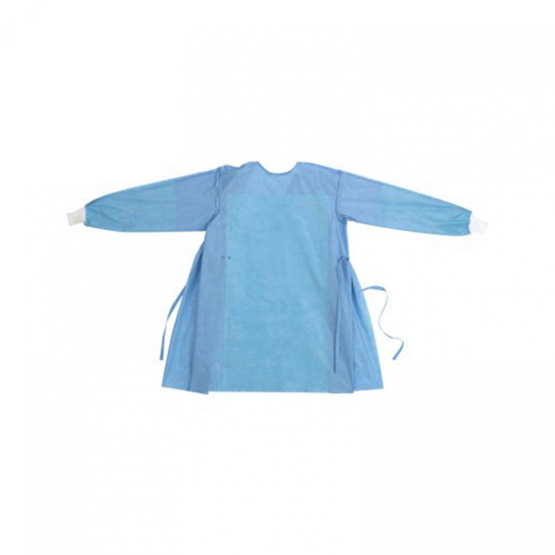Camice chirurgico sterile in SMMS idrorepellente con rinforzo nella parte frontale e nelle maniche, con polsini in maglina.