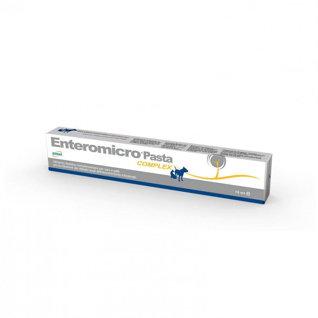 Alimento complementare per cani e gatti con lattobacilli micro-incapsulati e colostro. . Enteromicro Complex è l’alimento complementare ideale nei casi di: scarsa qualità delle feci nei cuccioli, a causa di un ecosistema intestinale non ancora in equilibrio e di cambi di alimentazione; diarrea, dovuta a cause primarie o secondarie: gastroenteriti alimentari e/o infettive; farmaci; stress comportamentali (ansia) o da performance (gare, lavoro, …); malassorbimento e, di conseguenza, scarso incremento ponderale; enteropatie croniche (es. malattie infiammatorie intestinali); coliti, più frequenti in alcune razze, come ad esempio il Pastore Tedesco. . Utilizzo: Compresse Cani – Ogni 10 Kg p.v. 1 compresso al giorno Gatti – Ogni 5 Kg p.v. ½ compressa al giorno Pasta Cani e gatti – Ogni 5 kg p.v. 1 tacca della siringa al giorno per almeno 6 giorni. . Formato: 15 ml pasta, confezione 32 compresse . Composizione: Lieviti idrolizzati (fonte di mannanoligosaccaridi); fruttoligosaccaridi; maltodestrine; magnesio stearato; colostro; pectine di agrumi; Sali di Acidi Grassi (fonti di Butirrati) + Butirrati; Rubus fructicosus; Foeniculum vulgare
