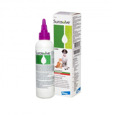 Detergente auricolare per cani e gatti. Formulazione con pH 6,8. Contiene una fragranza fresca che lascia le orecchie di cani e gatti pulite profumate. Utilizzo: applicare una quantità adeguata di SUROSOLVE alla base del condotto uditivo. Massaggiare con delicatezza la base dell'orecchio, asciugando con un panno il prodotto in eccesso. Non utilizzare questo prodotto in caso di rottura della membrana timpanica. Formato: flacone 125 ml.