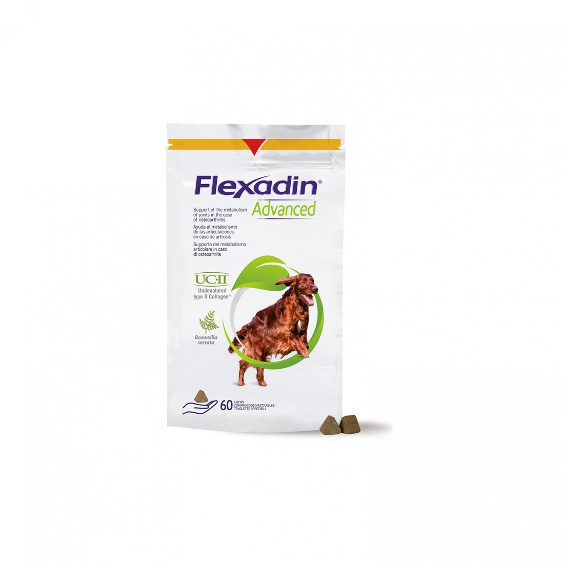 Contiene: UC-II (40mg/tavoletta appetibile), con collagene di tipo II non denaturato. Il collagene di tipo II è un importante componente della cartilagine. Boswellia serrata: un estratto di erbe tradizionalmente usato come supporto alla funzione articolare che contribuisce ai naturali processi di ripristino. Acidi grassi omega-3 e vitamina E, noti per le loro proprietà antiossidanti. La combinazione di questi ingredienti contribuisce a mantenere le articolazioni sane.