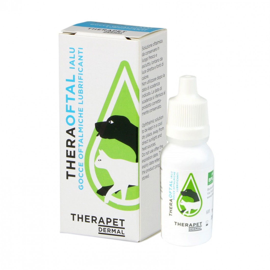 Theraoftal Ialu è una soluzione oculare lubrificante per cani e gatti, formulata con acido ialuronico per idratare e proteggere la superficie