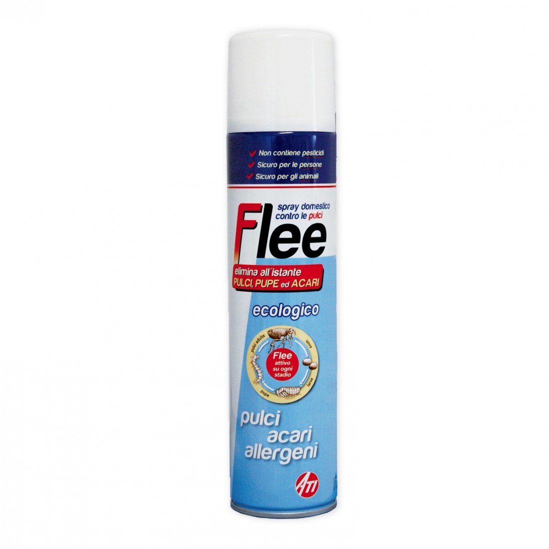Spray domestico contro le pulci, a base di dimeticone, che ricopre pulci, uova, larve epupe, arrestandone lo sviluppo. Questa azione meccanica impedisce alle pulci di sviluppare resistenze al trattamento. Flee controlla le infestazioni da pulci in ambiente domestico (case, automobili, caravan,etc.). Non è necessario trattare l’intera casa ma basta concentrarsi sulle zone che sono direttamente a contatto con gli animali e che potrebbero essere state infettate: letti per animali, tappeti, poltrone, divani, arredi in genere. Flee controlla attivamente pulci adulte, larve, uova e pupe per nove settimane dopo l’applicazione. Utilizzo: Dopo aver agitato il flacone puntare l'erogatore a circa 40 cm dalla superficie da trattare. La durata dell'erogazione varia da 7 a 14 secondi per metro quadro. Dopo il trattamento è necessario attendere circa 30 minuti perchè la zona trattata si asciughi completatmente. Formato: bomboletta spray da 400 ml.