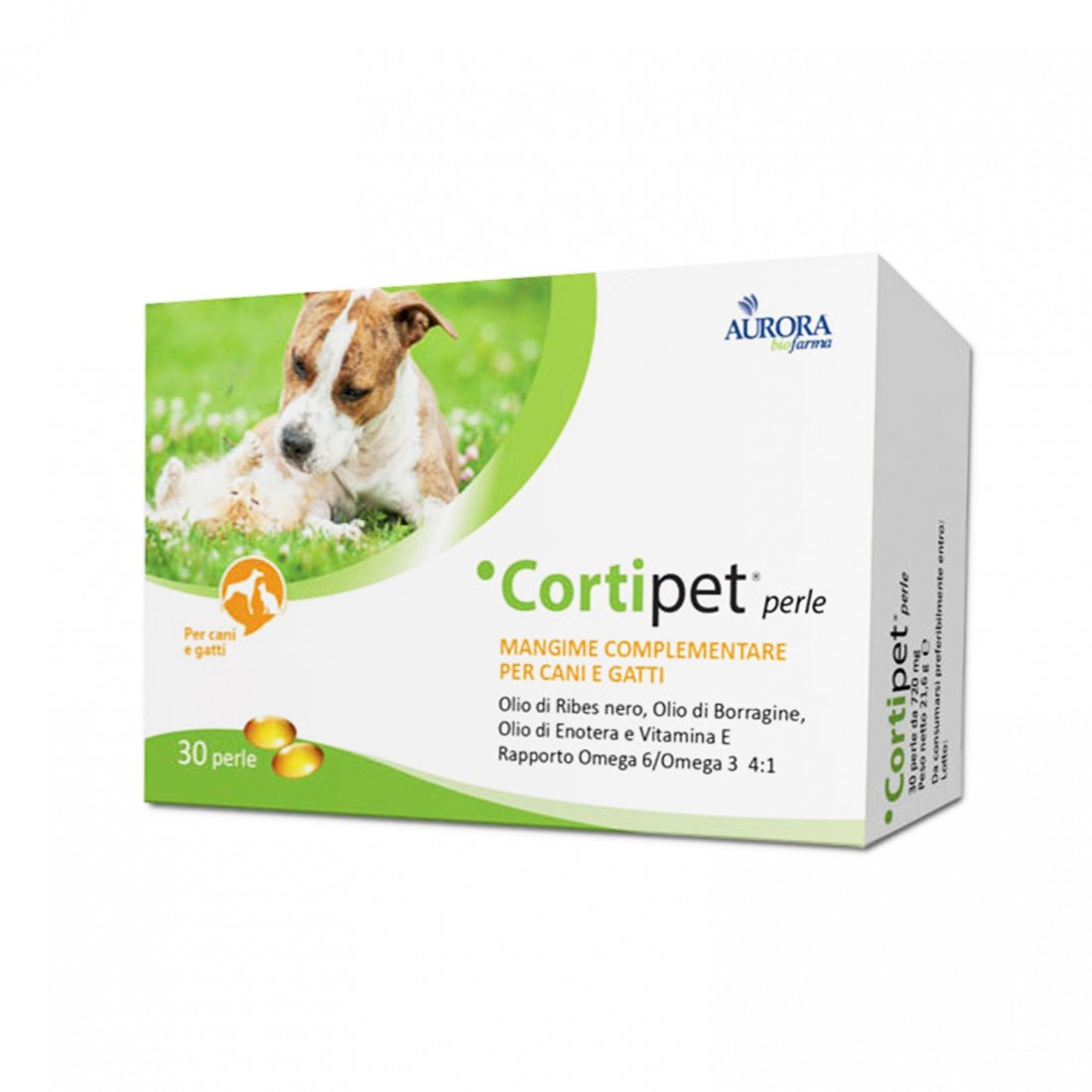 CORTIPET PERLE Mangime complementare per cani e gatti. Coadiuvante per il mantenimento del fisiologico benessere di cute e mantello (prurito, forfora, pelo spento e opaco) A BASE DI: Olio di Ribes Nero, Olio di Borragine, Olio di Enotera e vitamina E MODALITÀ D’USO: 1 perla