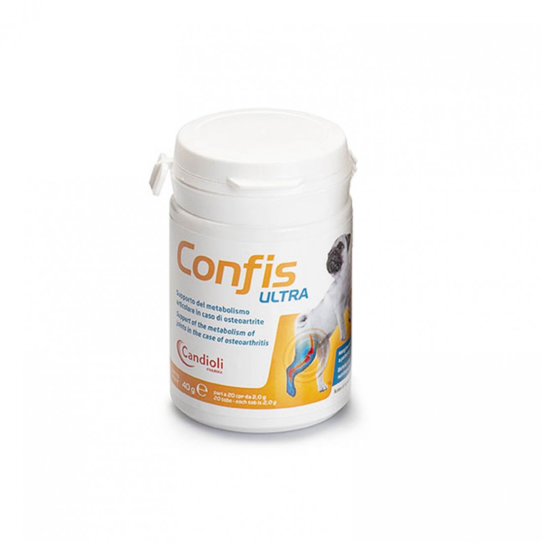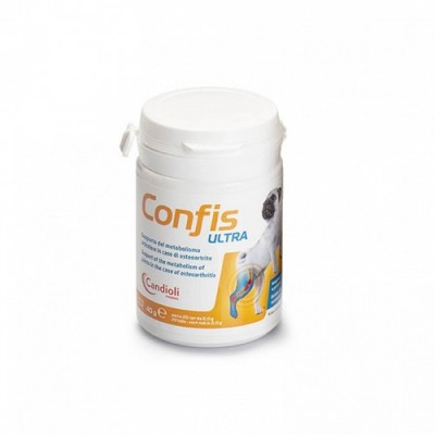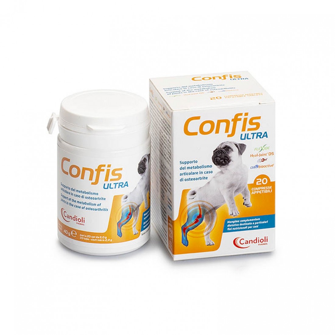 Confis Ultra è un mangime complementare dietetico per cani, formulato per il supporto del metabolismo articolare in caso di osteoartrite. Posologia Somministrare CONFIS Ultra direttamente in bocca o miscelare alla consueta razione alimentare secondo le seguenti quantità giornaliere: Cani 0-5 kg 1/2 compressa al dì 5-10 kg 1 compressa al dì 10-20 kg 2 compresse al dì 20-35 kg 3 compresse al dì 35-50 kg 4 compresse al dì oltre 50 kg 5 compresse al dì Periodo di impiego raccomandato: inizialmente fino a 3 mesi. Si raccomanda di chiedere il parere di un veterinario prima dell’impiego o prima di prolungare il periodo di impiego. Si consiglia di effettuare 2-3 cicli all’anno da 40 giorni di somministrazione continuativa per ottener il previsto beneficio sul metabolismo articolare. Le compresse possono essere somministrate in un’unica dose giornaliera. Formato: Barattolo da 20, 40, 80 e 240 cpr Principio attivo: glucosamina cloridrato (HCl) condroitin solfato