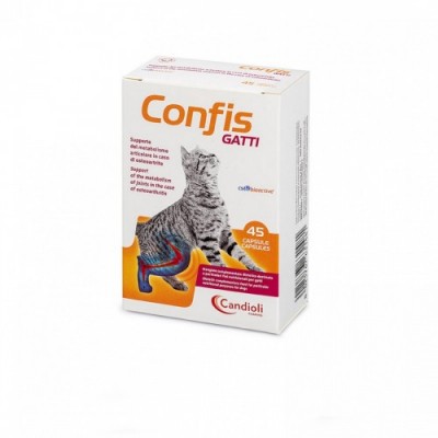 Confis Gatti è un mangime complementare dietetico per gatti, formulato per il supporto del metabolismo articolare in caso di osteoartrite. Confis Gatti è presentato in capsule contenenti una polvere appetibile. Le capsule di Confis Gatti devono essere aperte e il contenuto miscelato con il cibo o sparso su di esso. Se il gatto mangia cibo secco, l’alimento deve essere umidificato con una piccola quantità d’acqua, così da consentire l’adesione della polvere. In alternativa, il contenuto della capsula può essere miscelato ad una piccola quantità di cibo umido, così da assicurare una completa assunzione del prodotto. Posologia Somministrare Confis Gatti secondo le seguenti quantità giornaliere: 0-5 kg di peso: 1 capsula al dì +5 kg di peso: 2 capsule al dì Formato: 15 o 45 Capsule Principio attivo: condroitin solfato glucosamina cloridrato (HCl)