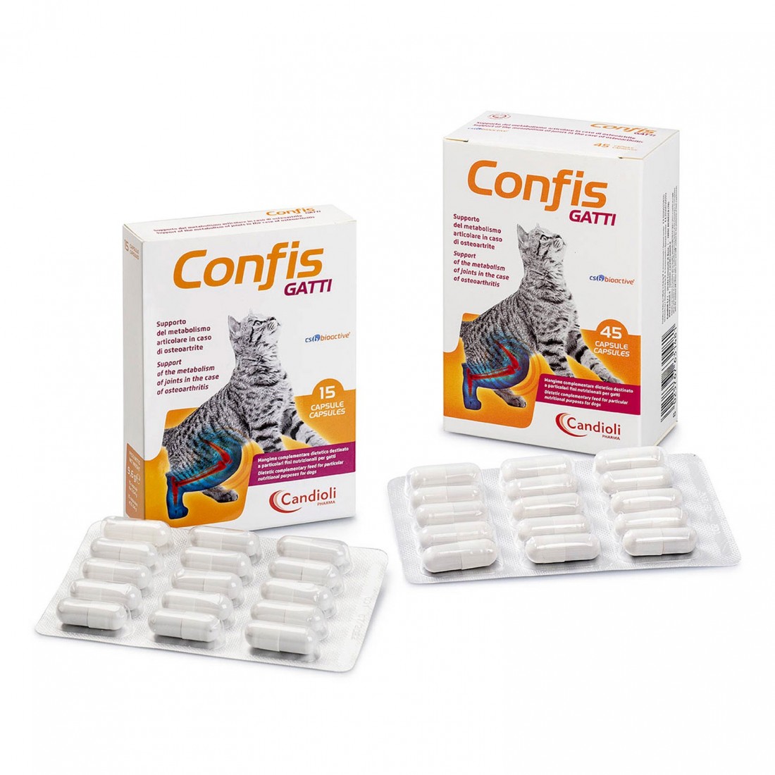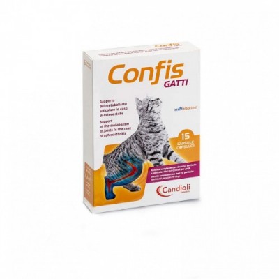 Confis Gatti è un mangime complementare dietetico per gatti, formulato per il supporto del metabolismo articolare in caso di osteoartrite. Confis Gatti è presentato in capsule contenenti una polvere appetibile. Le capsule di Confis Gatti devono essere aperte e il contenuto miscelato con il cibo o sparso su di esso. Se il gatto mangia cibo secco, l’alimento deve essere umidificato con una piccola quantità d’acqua, così da consentire l’adesione della polvere. In alternativa, il contenuto della capsula può essere miscelato ad una piccola quantità di cibo umido, così da assicurare una completa assunzione del prodotto. Posologia Somministrare Confis Gatti secondo le seguenti quantità giornaliere: 0-5 kg di peso: 1 capsula al dì +5 kg di peso: 2 capsule al dì Formato: 15 o 45 Capsule Principio attivo: condroitin solfato glucosamina cloridrato (HCl)