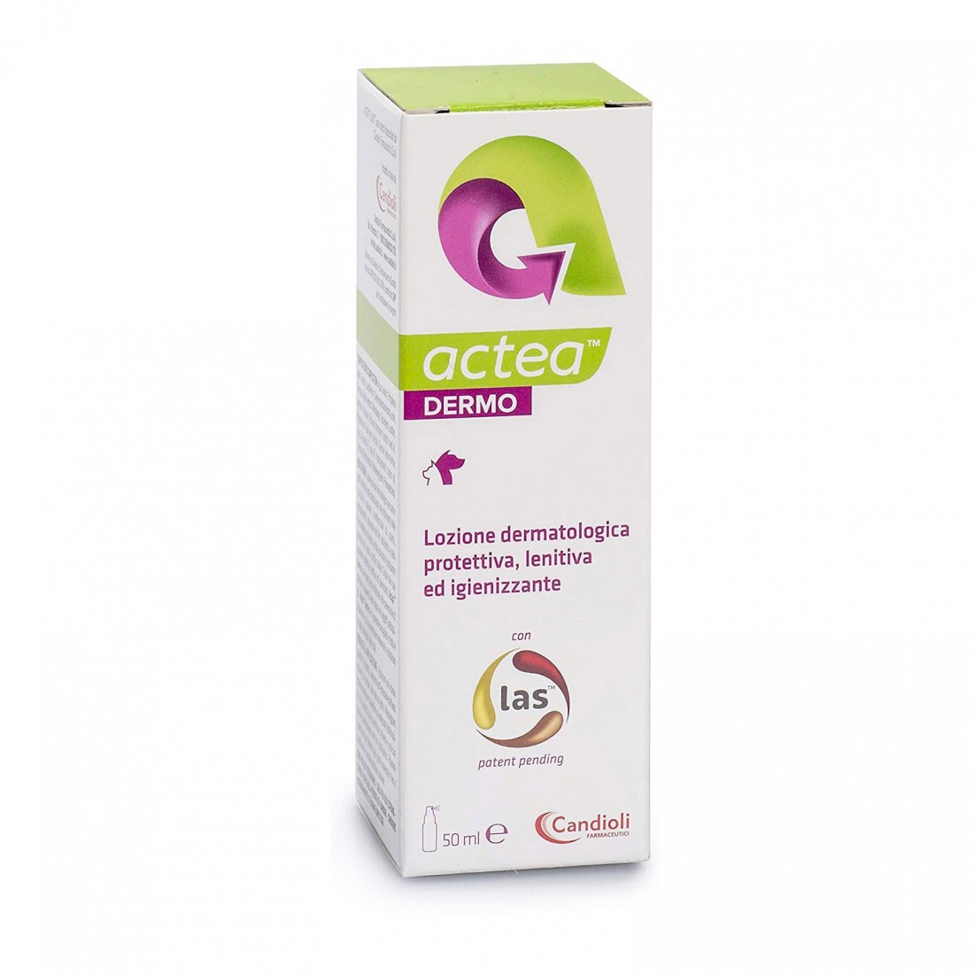 Lozione ad uso dermatologico per cani e gatti indicata come coadiuvante nel trattamento delle condizioni cutanee caratterizzate da prurito, arrossamento, alterazioni del film idrolipidico e della flora batterica e fungina, anche associate a produzione eccessiva di sebo e cattivo odore. Grazie alle sue proprietà protettive, lenitive ed igienizzanti, Actea Dermo può essere anche utilizzato nella prevenzione di affezioni cutanee di varia origine nei soggetti predisposti. Actea Dermo è in generale consigliato in tutte le situazioni in cui sia necessario preservare o ripristinare lo stato fisiologico della cute. Utilizzo: applicare un'idonea quantità di prodotto, a seconda dell'estensione dell'area cutanea da trattare, 2 volte al giorno. Massaggiare delicatamente per consentire una adeguata distribuzione del prodotto sulla superficie cutanea e una sua idonea penetrazione nel film idrolipidico. Ripetere l'operazione per 10-20 giorni consecutivi, fino a ripristinare le normali condizioni cutanee. Formato: flacone spray da 50 ml.