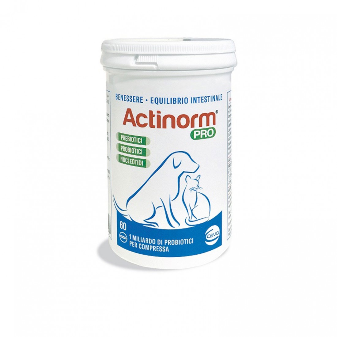 Actinorm Pro è un bioregolatore naturale della funzionalità intestinale costituito da frutto-oligosaccaridi, probiotici e nucleotidi. Actinorm Pro può essere utilizzato: - per normalizzare l'attività intestinale in caso di: a) diarrea, b) terapie antibiotiche, c) dismicrobismi intestinali - durante i cambi di alimentazione - per ridurre la produzione di gas intestinali e l'odore delle feci Utilizzo: Cani: - 2 compresse al giorno fino a 10 kg di peso corporeo - 3 compresse al giorno da 11 a 20 kg di peso corporeo - 4 compresse al giorno oltre i 20 kg di peso corporeo Gatti: 1-2 compresse secondo la taglia Formato: flacone da 60 compresse