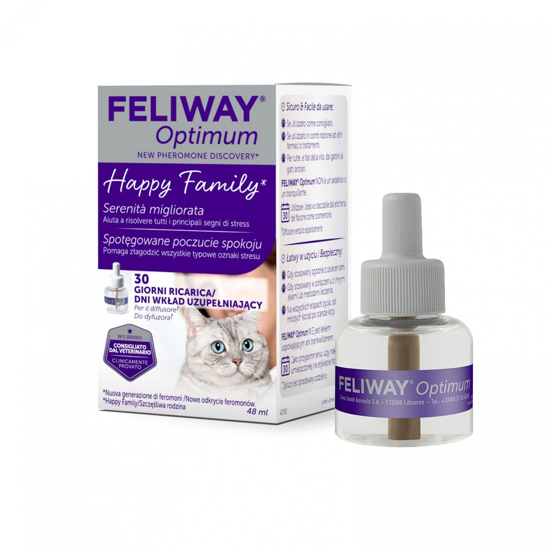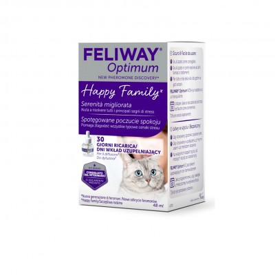 FELIWAY® Optimum aiuta i gatti che presentano più segni di stress contemporaneamente, in diverse situazioni e li calma nel miglior modo possibile. FELIWAY® Optimum è la soluzione per gli amanti dei gatti che aiuta a risolvere tutti i comuni segni di stress: marcature urinarie, graffiature, nascondersi, paure, tensioni e conflitti tra i gatti, cambiamenti (nuova casa, nuovo ambiente, nuovi mobili, ristrutturazioni...). FELIWAY® Optimum è anche consigliato in caso di: diminuzione dell’appetito, ridotta attività, toelettatura eccessiva, arrivo di un nuovo gatto in famiglia, uso veterinario (consultazione, ricovero in ospedale). In alcuni casi potrebbero essere richieste ulteriori terapie comportamentali, modifiche ambientali e si dovrebbe chiedere consiglio al proprio veterinario. In caso di segni di malattia, consultare il veterinario. Posologia: Posizionare il diffusore nella stanza dove i gatti trascorrono la maggior parte del tempo. Per risultati ottimali, mantenere il diffusore collegato 24 ore su 24, 7 giorni su 7 e utilizzarlo per almeno 30 giorni. Formato: Confezione con diffusore + ricarica da 48ml / Confezione con ricarica da 48ml