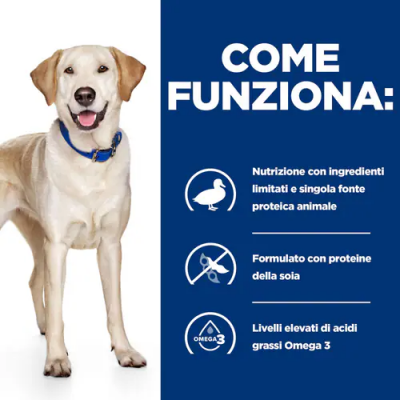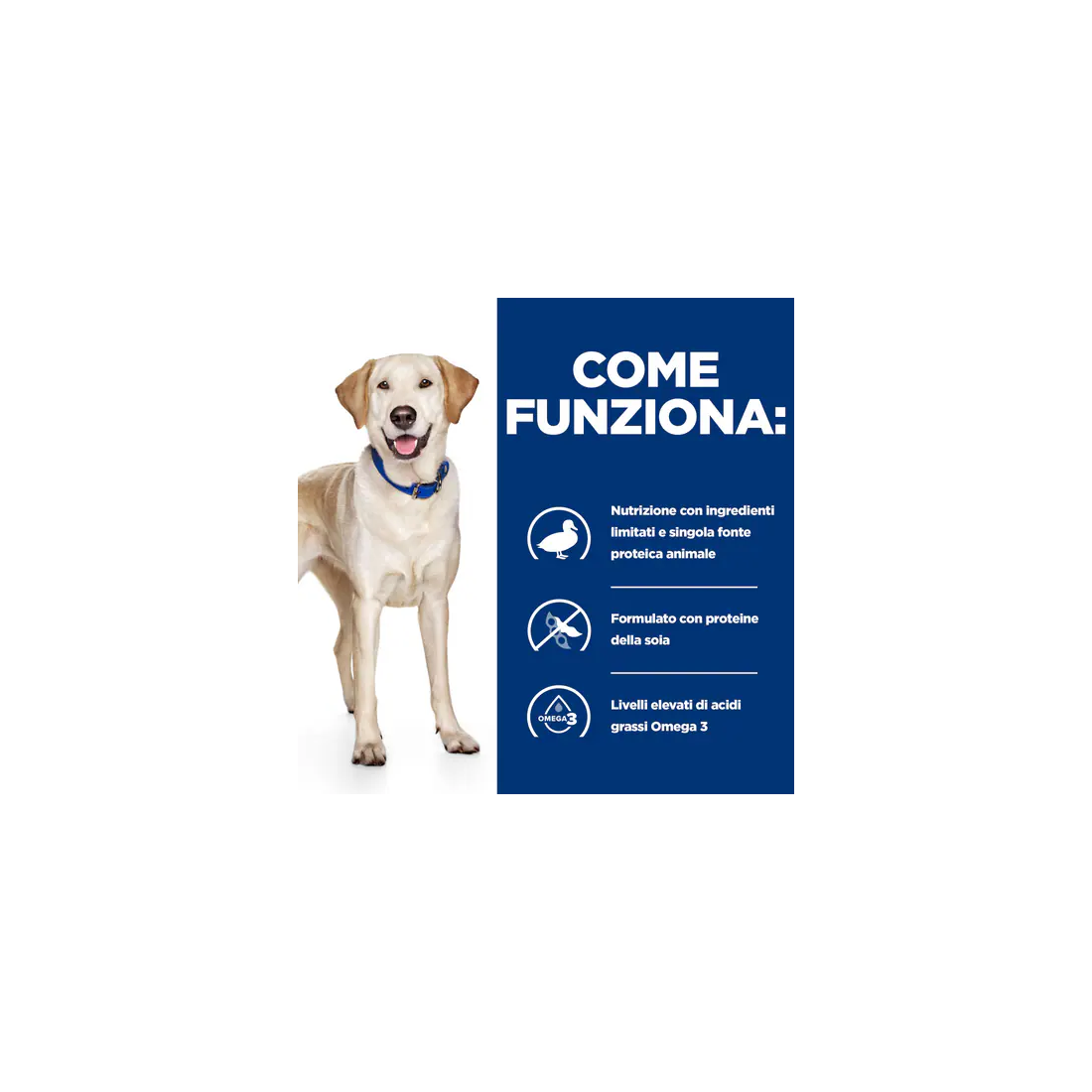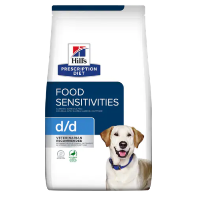 Prescription Diet d/d alimento secco per cani è appositamente formulato da nutrizionisti e veterinari Hill's per aiutare i cani con sensibilità alimentare ed è clinicamente testato per aiutare a evitare reazioni avverse al cibo.