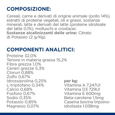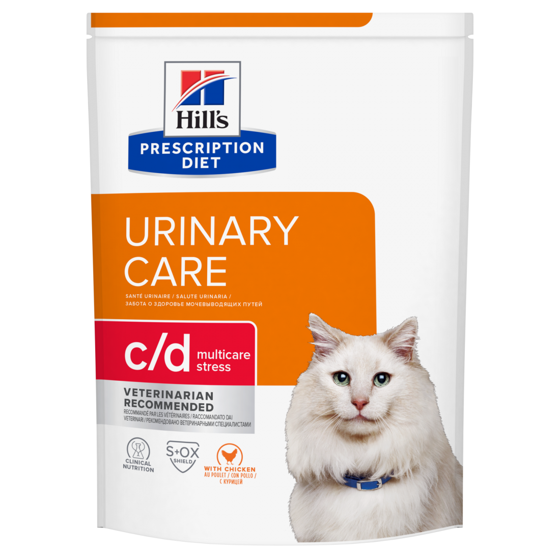 I nutrizionisti e veterinari di Hill's hanno sviluppato Prescription Diet c/d Multicare Stress, una nutrizione dietetica appositamente formulata per supportare la salute urinaria del gatto e allo stesso tempo gestire lo stress. Infatti c/d Multicare è un'alimentazione clinicamente testata per ridurre dell'89% la ricorrenza dei più comuni segni urinari. Questo alimento secco è fatto con pollo e ha un gusto irresistibile che il tuo gatto adorerà.