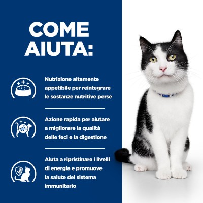 Hill's Prescription Diet i/d Alimento per Gatti è un alimento altamente digeribile formulato appositamente per aiutare a ridurre i disturbi gastrointestinali e garantire un facile assorbimento dei nutrienti. È arricchito con elettoliti e vitamine del gruppo B che aiutano a sostituire i nutrienti persi. Realizzato con la tecnologia esclusiva di Hill's ActivBiome+, una speciale miscela di fibre prebiotiche, clinicamente dimostrata di nutrire rapidamente il microbioma intestinale per supportare la qualità ottimale delle feci e la salute dell'apparato digerente. Arricchito con Omega-3 e Omega-6 e antiossidanti clinicamente testati per aiutare a sostenere un sistema immunitario sano.