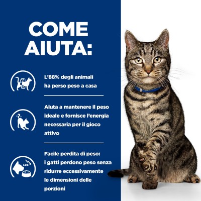 I nutrizionisti e i veterinari Hill's hanno sviluppato Prescription Diet Metabolic una nutrizione clinica appositamente formulata per supportare la gestione del peso del tuo animale domestico. Infatti, l'88% degli animali domestici ha perso peso in casa in 2 mesi se nutrito con l'alimentazione Metabolic. Questo alimento secco è fatto con tonno e ha un gusto irresistibile che il tuo animale domestico adorerà.