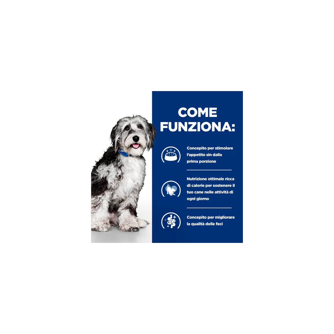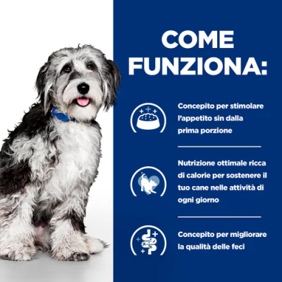- Un'alimentazione ottimale ricca di calorie per aiutare a sostenere l'attività quotidiana del tuo cane