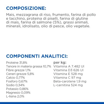 Hill's Science Plan Sterilised Cat Adult Alimento secco per gatti con salmone è un alimento completo ed equilibrato, studiato per soddisfare le esigenze dei gatti sterilizzati di età compresa tra 1 e 6 anni..