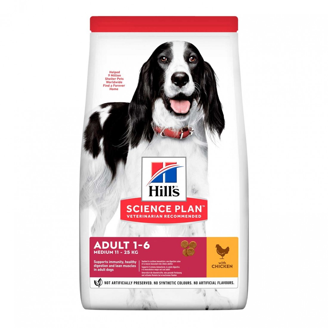 Hill's™ Science Plan™ MEDIUM ADULT ALIMENTO PER CANI con POLLO (pollo 9%; pollame totale 14%) è un alimento completo per cani adulti di taglia media da 1 a 6 anni d'età.