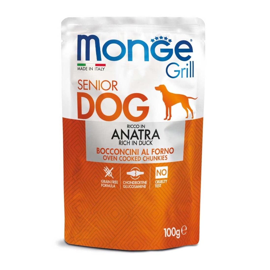Carni e derivati 45% (anatra 14%), sali minerali, glucosamina 0,008%, solfato di condroitina 0,004%.