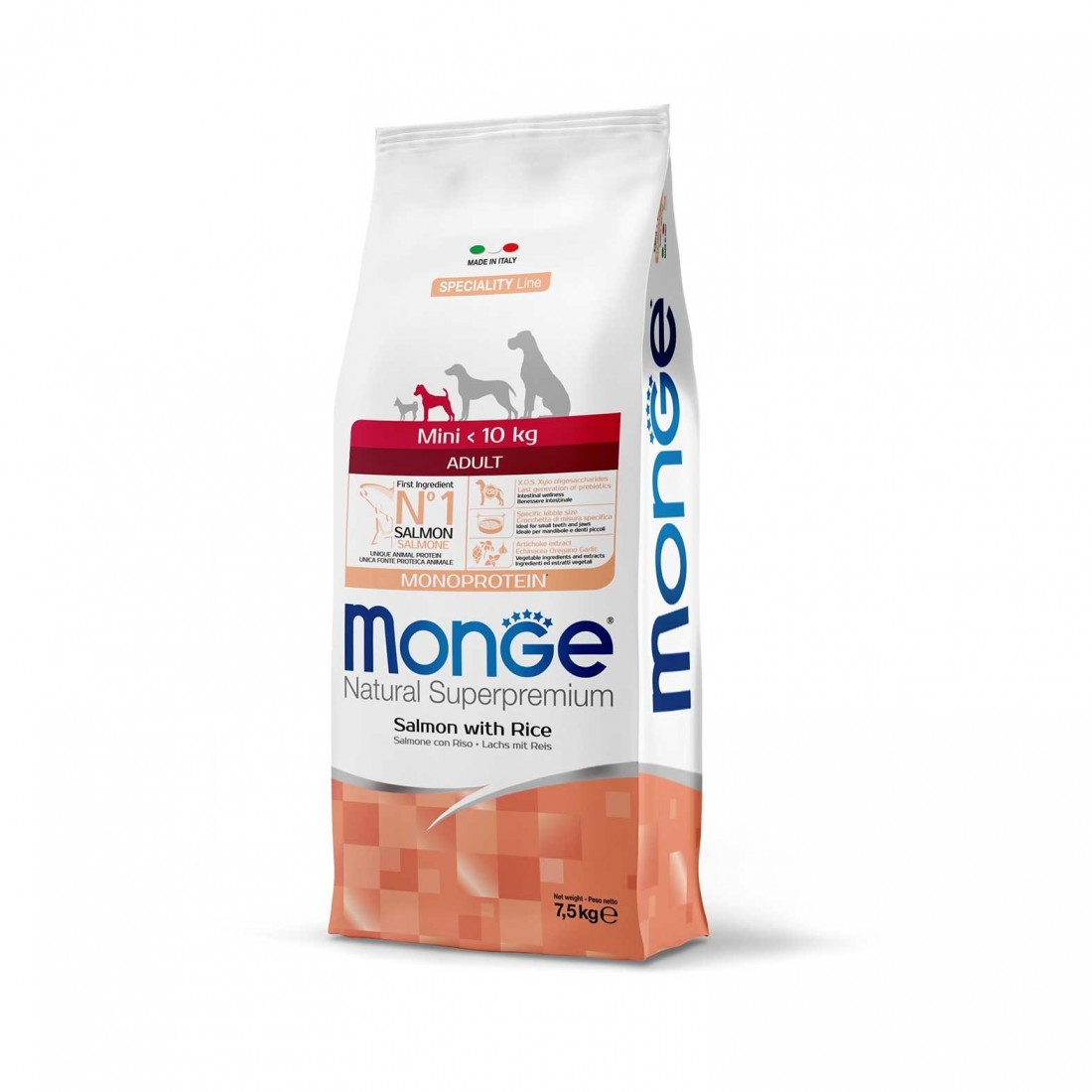 Monge Natural Superpremium Mini Adult Monoprotein* Salmone con Riso è un alimento completo per cani adulti di taglia mini.