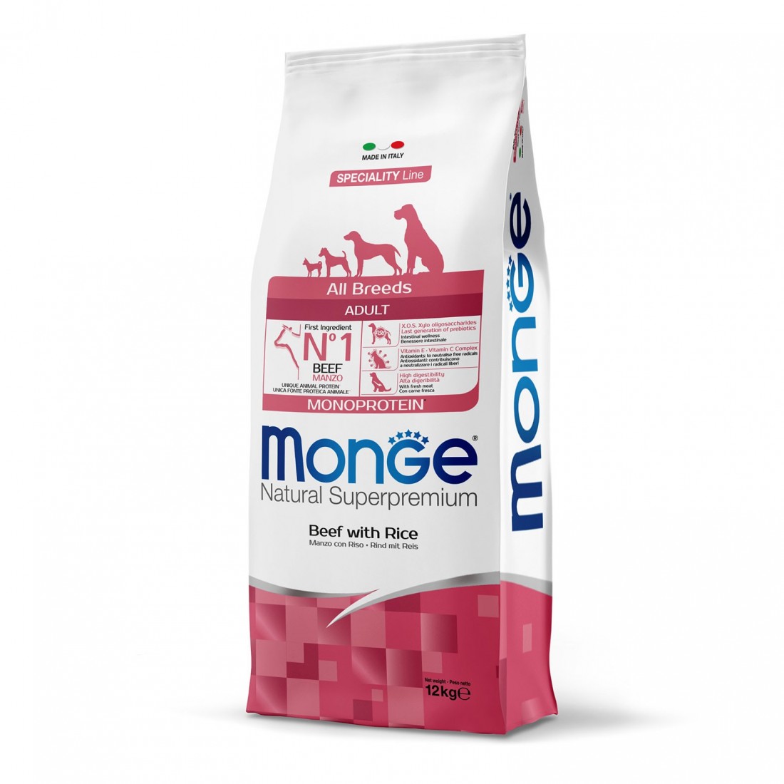 Monge Natural Superpremium All breeds Adult Monoprotein* Manzo con Riso è un alimento completo per cani adulti di tutte le taglie.