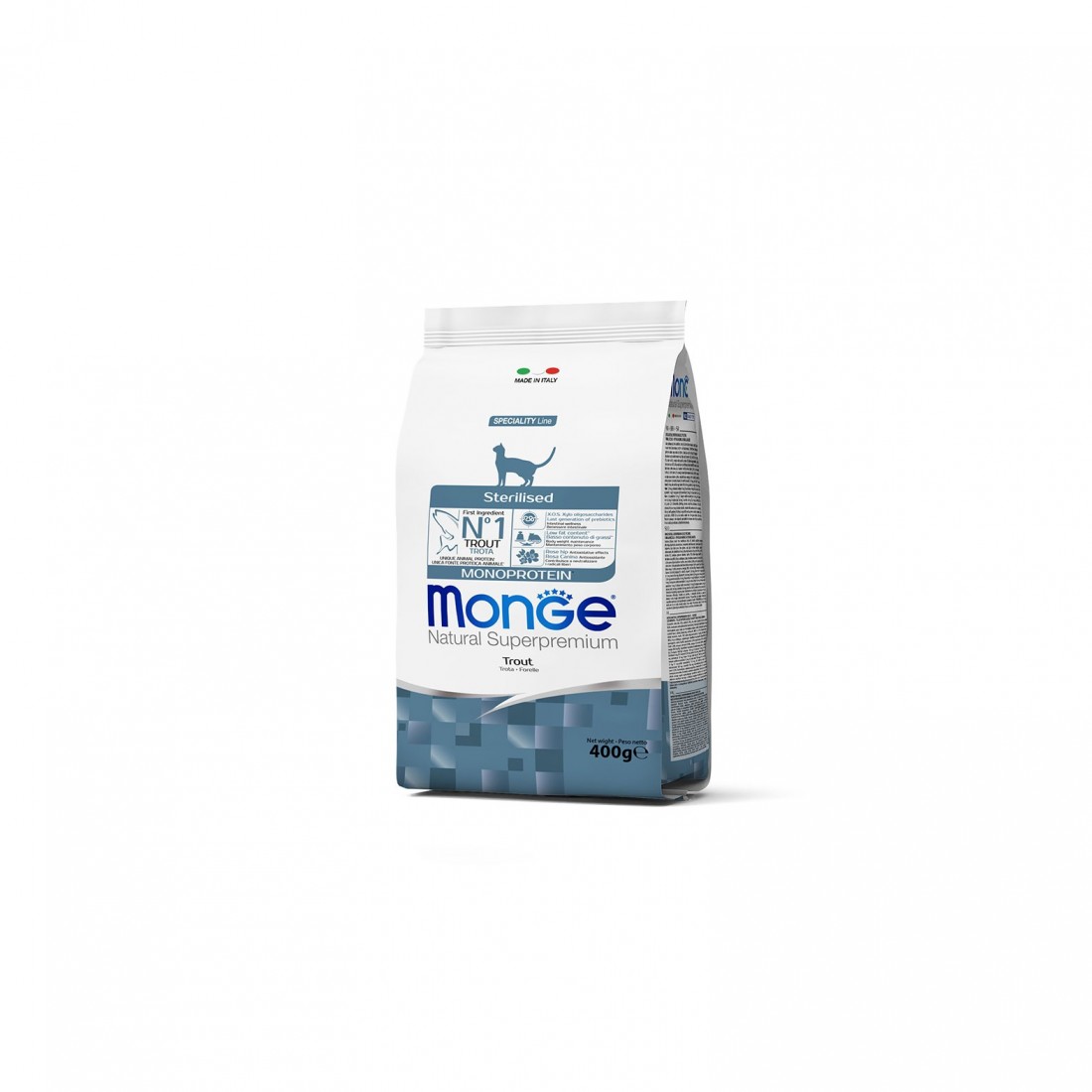 Monge Natural Superpremium Monoprotein* Gatto Sterilizzato Trota è un alimento completo per gatti adulti. Formulato appositamente per il tuo gatto adulto sterilizzato grazie alla presenza di un basso contenuto di grassi** per favorire il mantenimento del peso corporeo ideale.