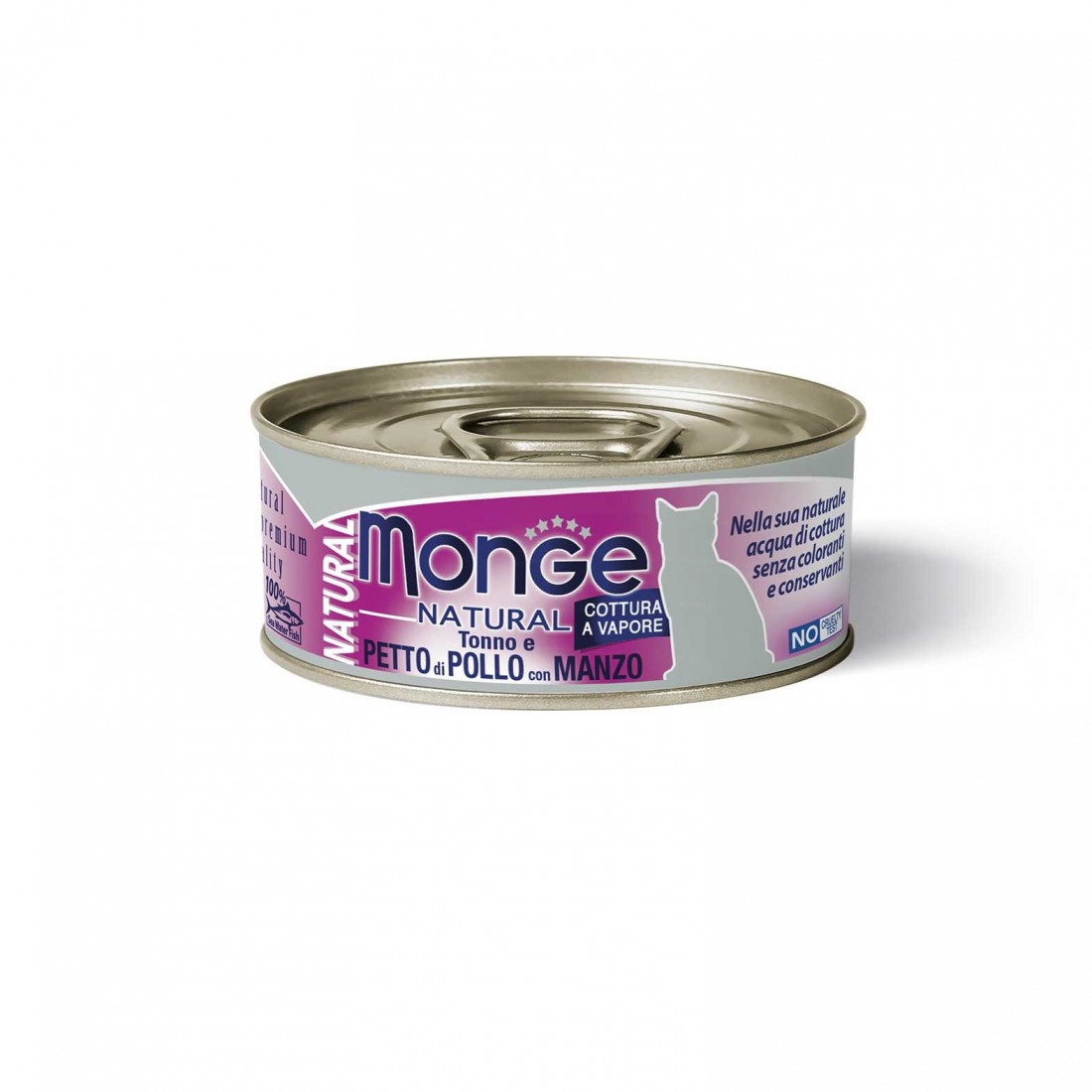 MONGE NATURAL TONNO E PETTO DI POLLO CON MANZO è un alimento complementare per gatti adulti, cotto a vapore, preparato con materie prime selezionate per le loro qualità nutrizionali.