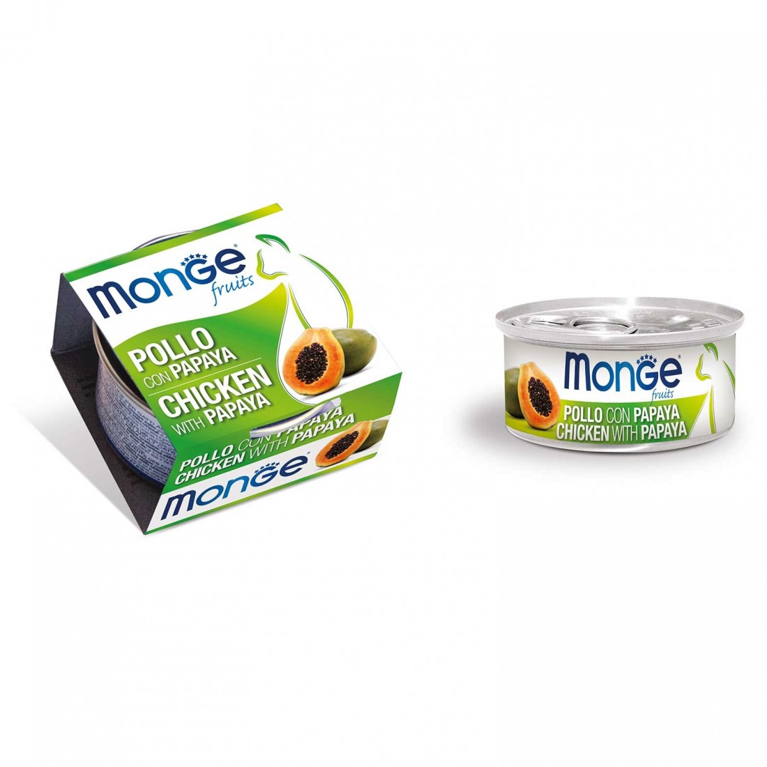 MONGE FRUITS POLLO CON PAPAYA è un alimento complementare pensato per i gatti adulti, preparato con materie prime selezionate per la loro naturale freschezza e rese ancora più gustose e appetibili grazie alla cottura al vapore.