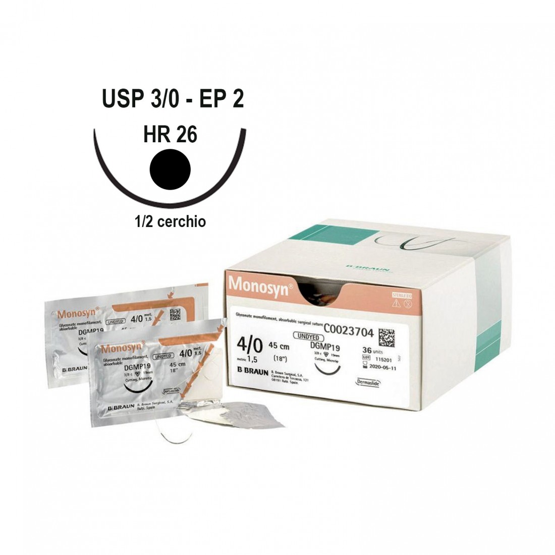Indicazioni: Sutura MONOSYN assorbibile. Monofilamento in gliconato, alta tenuta del nodo, di elezione per la chirurgia dei tessuti molli Sottocute ■ Intracute ■ Mucose ■ Gastrointestinale ■ Ginecologia ■ Urologia ■ Legature Controindicazioni: Tipologie di utilizzo che richiedano tenuta prolungata tramite inserimento di suture a lungo assorbimento o non assorbibili. Formato: 3/0 (3) 70 cm hr26