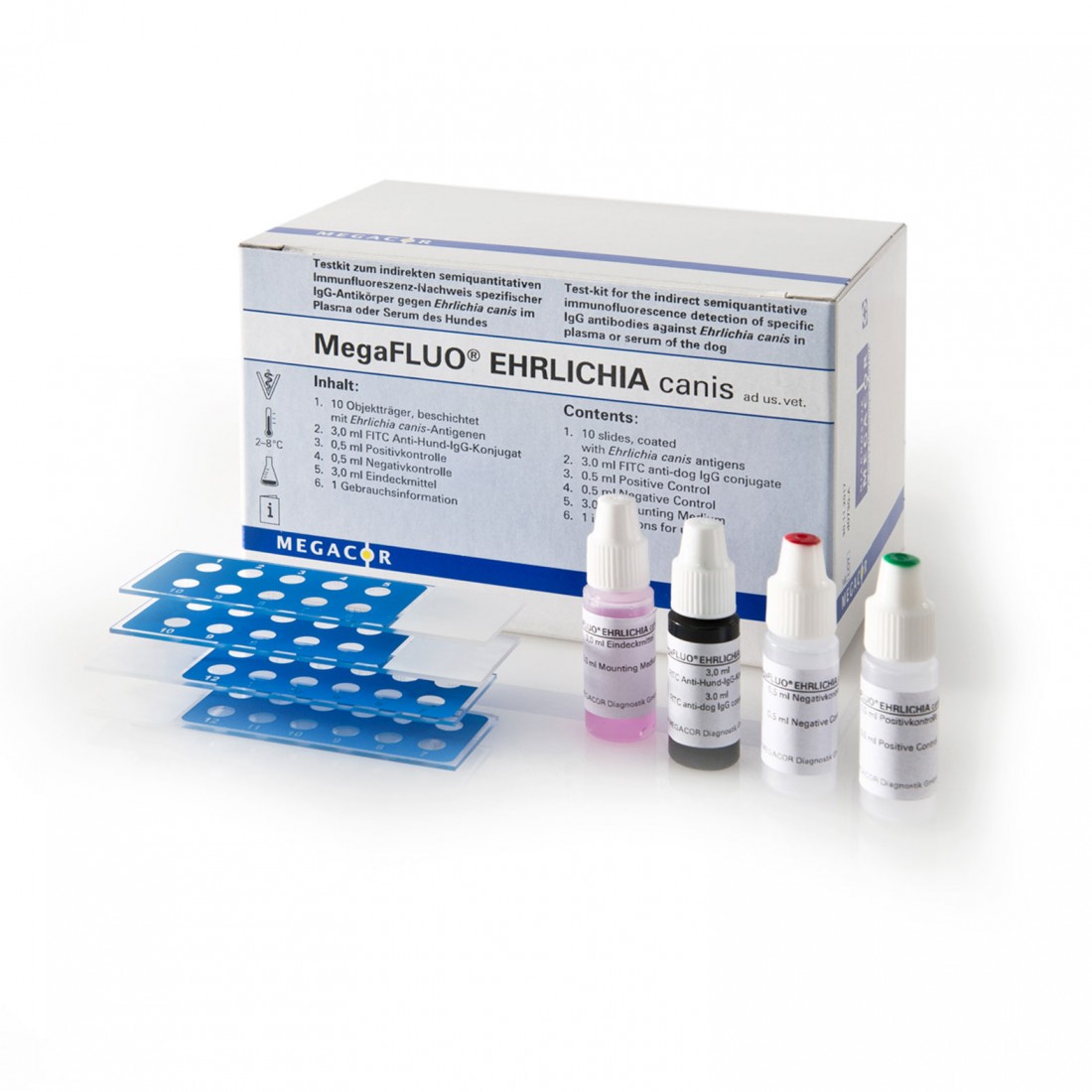 MegaFLUO® EHRLICHIA canis è un test-kit per la rilevazione di immunofluorescenza semiquantitativa indiretta di anticorpi IgG specifici contro Ehrlichia canis nel plasma o nel siero del cane.