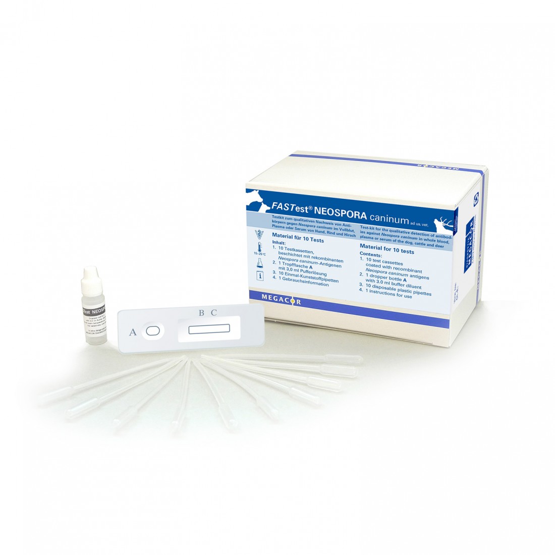 FAST est® NEOSPORA caninum è un test immunocromatografico rapido per la rilevazione qualitativa di anticorpi controNeospora caninumnel sangue intero, plasma o siero di cane, bovini e cervi. Neospora caninum svolge un importante ruolo epidemiologico nei cani e nei bovini. Il cane (specialmente i cani da guardia, i cani randagi) è un ospite definitivo (neosporosi intestinale) ed espelle le oocisti infettive con le feci. L'ospite intermedio, in particolare bovini, ma anche capre, pecore e cavalli, viene infettato tramite pascoli e / o acqua contaminati da oocisti (infezione orizzontale diretta / esogena) e / o intrauterina tramite madri già infette (infezione verticale indiretta / endogena). Per gli esseri umani, non vi è alcun rischio zoonotico. N. caninum svolge un ruolo importante nell'aborto nei bovini in tutto il mondo. Le caratteristiche stanno accumulando aborti in tutti gli stati di gestazione, parti morte e vitelli deboli. Il cane può fungere anche da ospite intermedio (trasmissione endogeno-diaplacentare al feto) e quindi può ammalarsi di neosporosi (neosporosi sistemica). Nel cane la sintomatologia si concentra soprattutto sui disturbi neurologici: paresi / paralisi degli arti posteriori, successivamente anche degli arti anteriori, nonché polimielite, radicolite ed encefalomielite. Inoltre, possono verificarsi atrofia muscolare, iperestensione, iperestesia e disfagia. Inoltre, possono comparire epatite, polmonite, miocardite e dermatite ulcerosa. Nei cani anziani l'infezione da Neospora di solito è asintomatica! I cuccioli diventano clinicamente evidenti all'età da 3 a 9 settimane fino a un anno. La diagnosi precoce e quindi la terapia specifica sono essenziali per la prognosi. A causa di studi recenti, sembra esserci una predisposizione dei cani maschi aX. cane . A causa del breve periodo di escrezione e della bassa quantità di oocisti nelle feci del cane, il rilevamento degli anticorpi utilizzando FAST est® NEOSPORA caninum diventa molto importante per la diagnosi di una neosporosi. A causa della trasmissione placentare orizzontale, ma particolarmente importante dal punto di vista economico, verticale, dell'infezione alla prole, gli stock di bovini sospetti dovrebbero essere testati per gli anticorpi contro N. caninum utilizzando FAST est® NEOSPORA caninum. In caso di "problema di neosporosi", può portare a un'efficace riduzione a lungo termine dei rischi di aborto e quindi a una riduzione del danno economico. Specifiche Rilevamento di Anticorpi Materiale campione: Sangue intero, plasma o siero Tempo / durata del test 15 minuti Conservazione Temperatura ambiente (15–25 ° C) Sensibilità 96.2 % Specificità 100 % Metodo di confronto Immunofluorescenza Test procedure Test rapido Formato 836010RK1 1 kit di test con 10 cassette di test