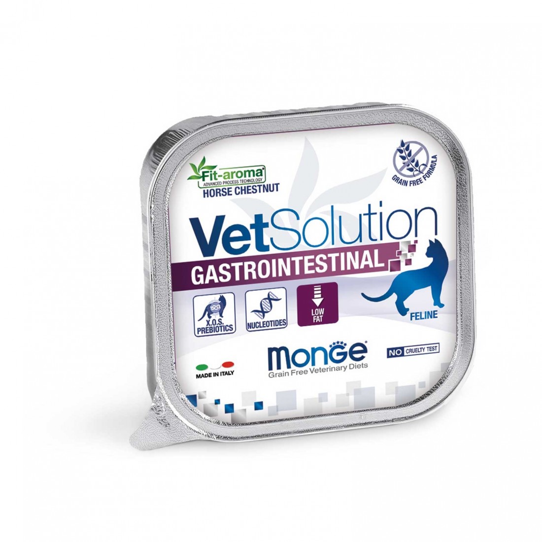 MONGE VETSOLUTION GASTROINTESTINAL FELINE è un alimento dietetico completo per gatti formulato per la riduzione dei disturbi dell’assorbimento intestinale. Contiene concentrato di succo di melone per neutralizzare i radicali liberi, ippocastano per il supporto intestinale, Xilo-oligosaccaridi (XOS) per preservare il microbiota intestinale.